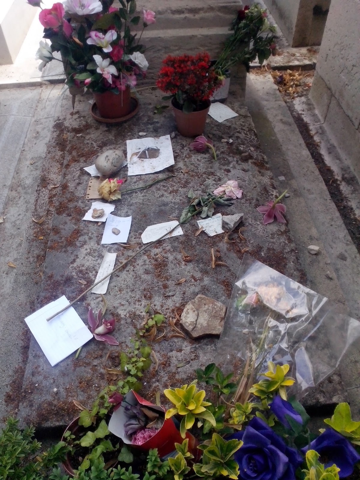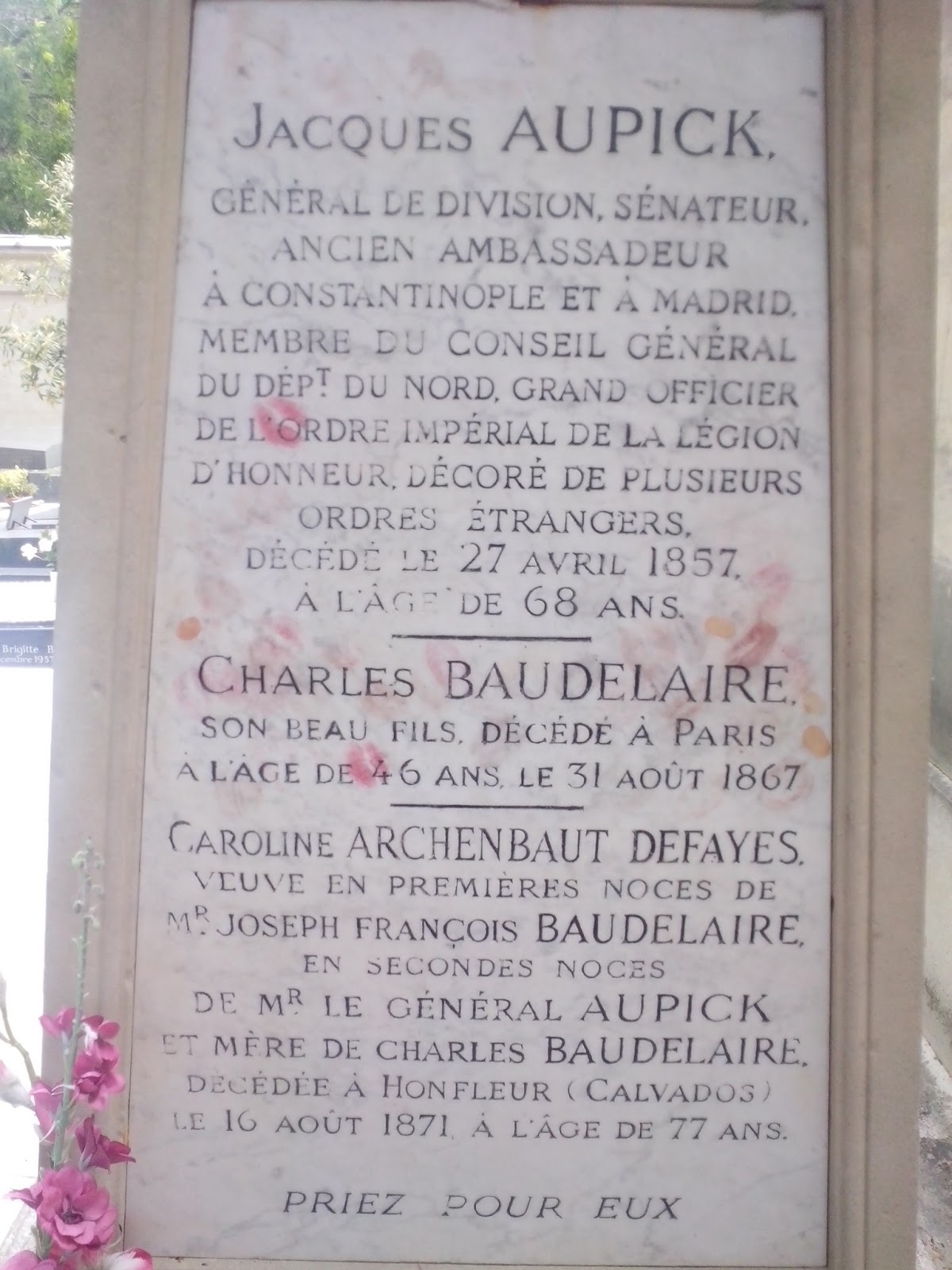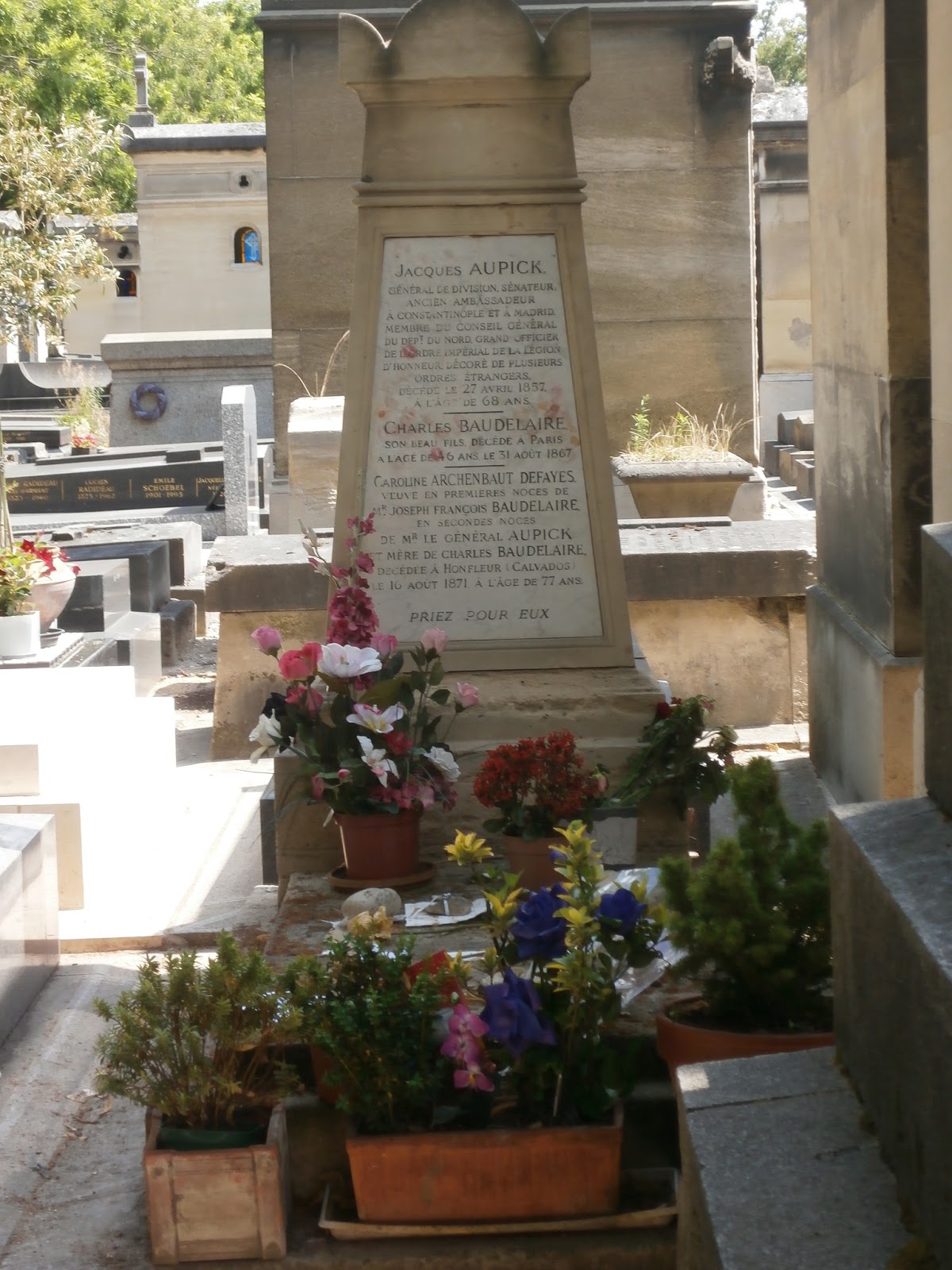 Długo nie mogłam znaleźć grobu Mistrza. Czytałam gdzieś w sieci, że jest skromny, prosty i urokliwy. Gdy w końcu go odkryłam, widok złamał mi serce. Przede wszystkim Baudelaire nie leży sam, a ze swym ojczymem. Prosty skromny posąg ukryty jest w cieniu pięknej krypty (nie zwróciłam uwagi czyjej). Na grobie spoczywają pamiątki pielgrzymów takich jak ja – świeże kwiaty, kawałki listów. Niestety, nie ma w tym uroku, którego się spodziewałam, a jest chaos, pośpiech… Charles, zasługujesz na piękniejsze miejsce. Ale mam nadzieję, że w tym momencie dla Ciebie to już nie ma znaczenia.