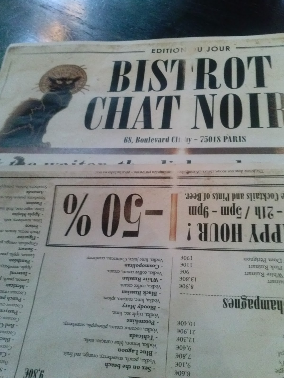 Na koniec wędrówki lądujemy w restauracji (??) Chat Noir. Miejsce stuletnie, sygnowane znakiem Czarnego Kota (wiki). Jem przepyszną sałatkę z owoców morza i rozkoszuję się drinkiem z prawdziwym szampanem. Słucham muzyki na żywo, artysta wyśpiewuje przy fortepianie znane i lubiane przeboje. Obserwuję kelnera, który ściska dzieci, a do bawiących się młodych kobiet wykonuje lubieżne gesty. Z nadzieją patrzę przez szybę – kilka godzin wcześniej wyczytałam, że gdzieś tu mieszka Johny Depp.Odpoczywam, chłonę atmosferę… wolności. Chciałoby się rzec: rozpusty, ale wbrew pozorom to nie to na Montmartre jest najważniejsze. Liczy się spokój, możliwość bycia kim się chce, zero tabu, relaks i zabawa.