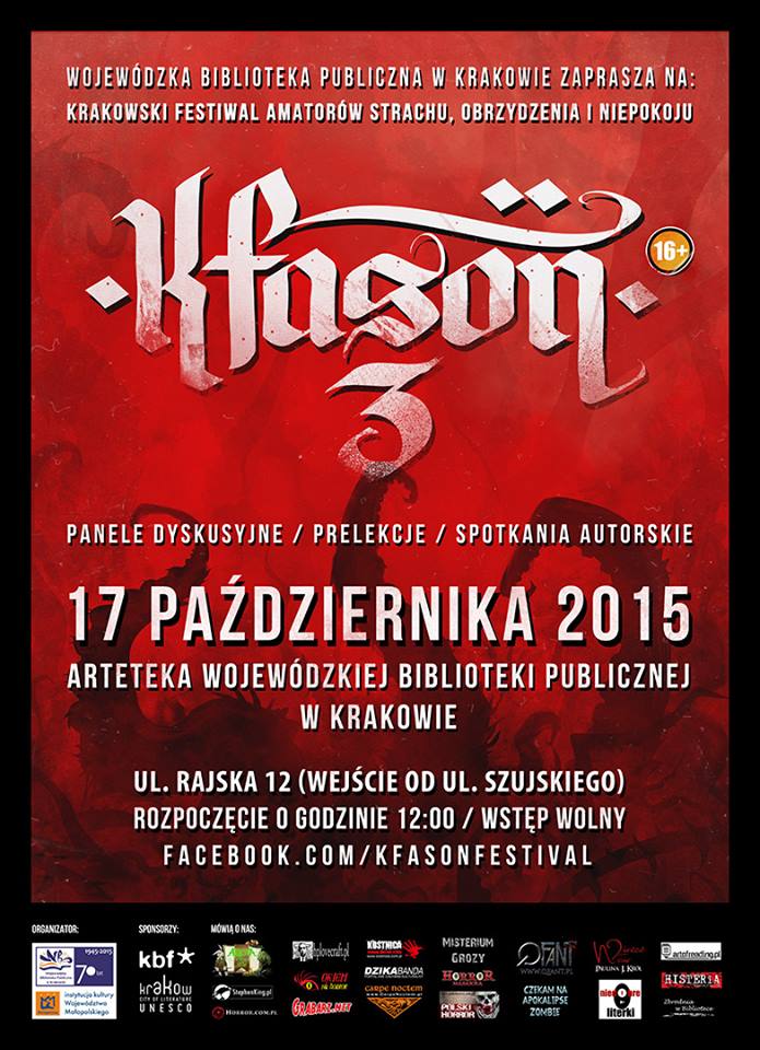 Umiłowani w grozie! Już w najbliższą sobotę festiwal, na który czekamy cały rok – KFASON – Krakowski Festiwal Amatorów Strachu Obrzydzenia i Niepokoju. W tym roku odbywa się trzecia edycja, a ja z radością mogę oświadczyć, że w końcu uda mi się także tam pojawić!