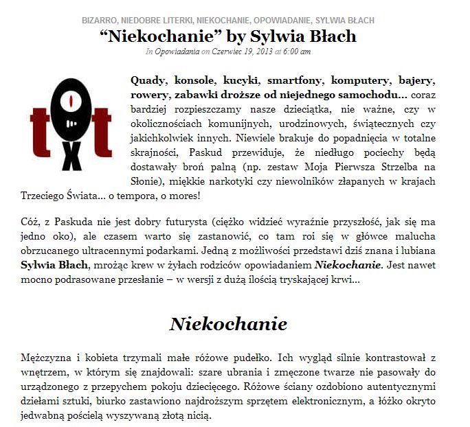 Kochani, dziś na Niedobrych Literkach pojawił się tekst, o którym nieśmiało wspominałam od jakiegoś czasu, a który od poniedziałku oficjalnie zapowiadałam. Opowiadanie nosi tytuł „Niekochanie” i jest swego rodzaju przestrogą przed… rozpieszczaniem dzieci. Brzmi dziwnie, biorąc pod uwagę fakt, że zwykle tworzę wszelkiego rodzaju mroczne historie? Przecież to bizarro, musi być dziwnie!
