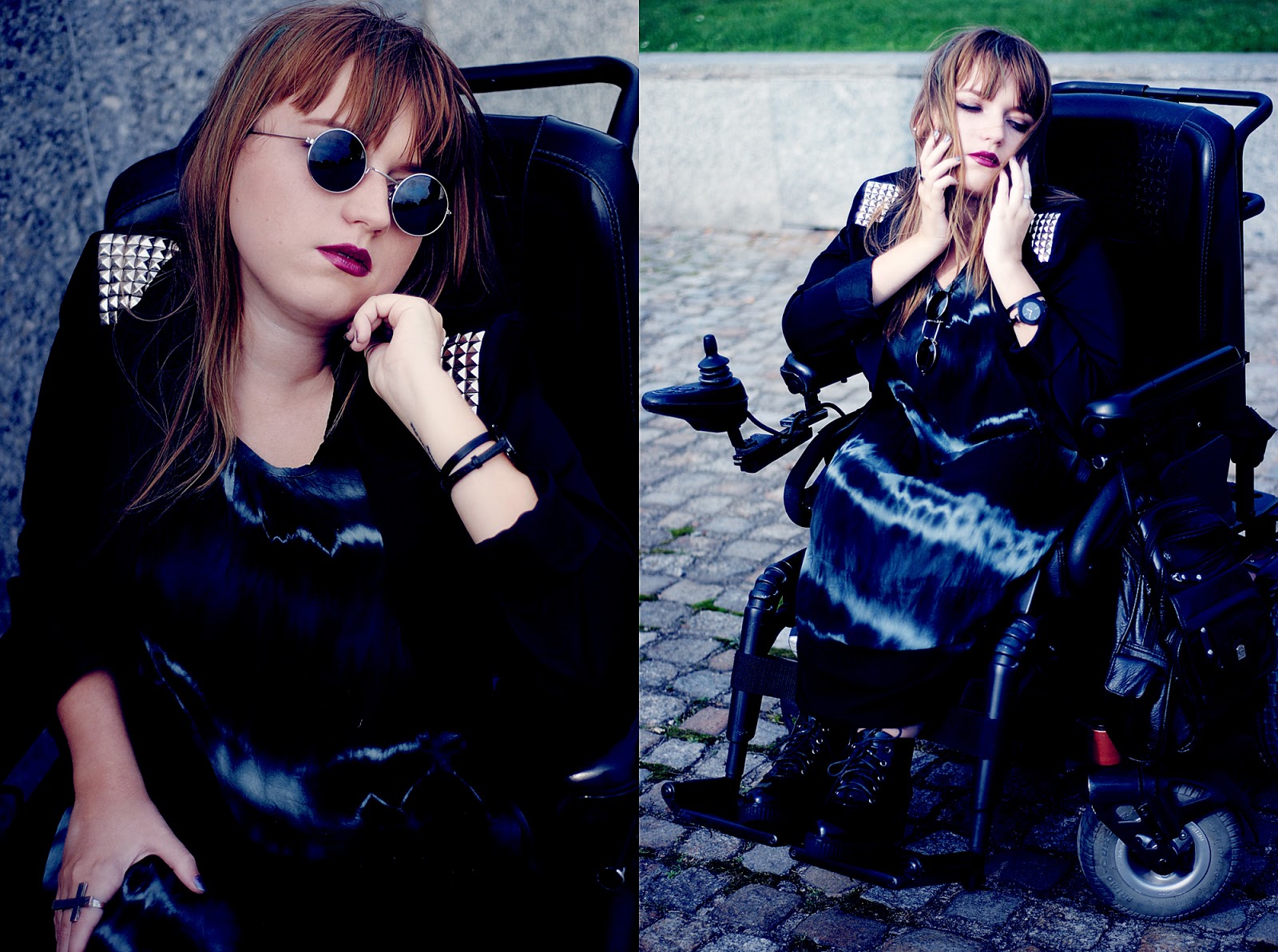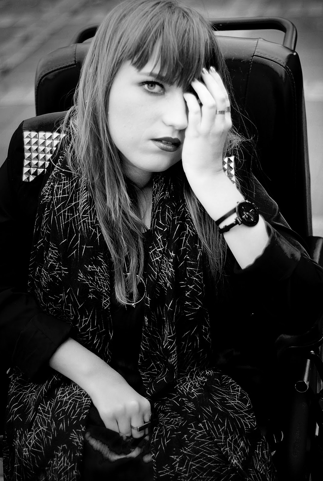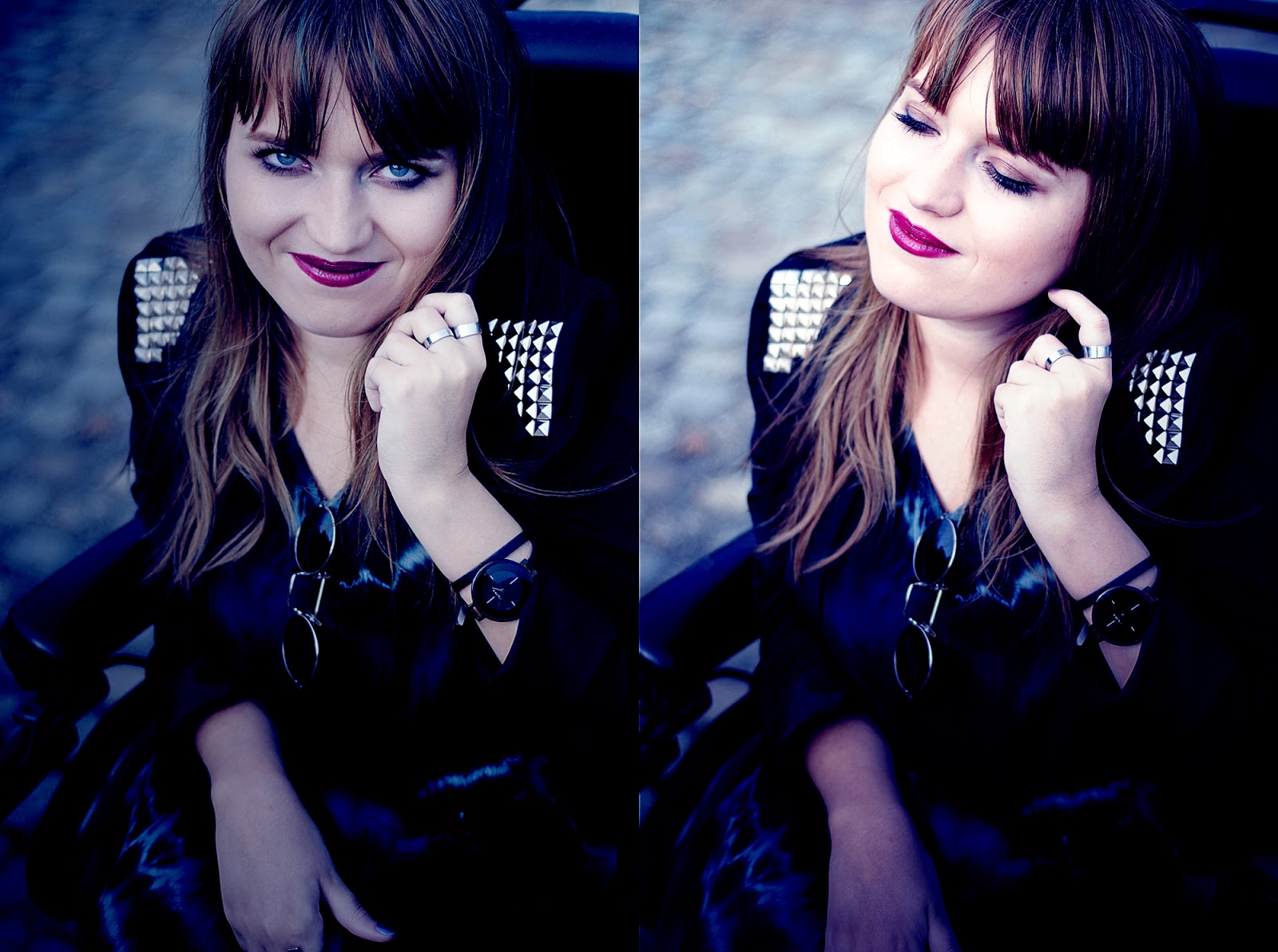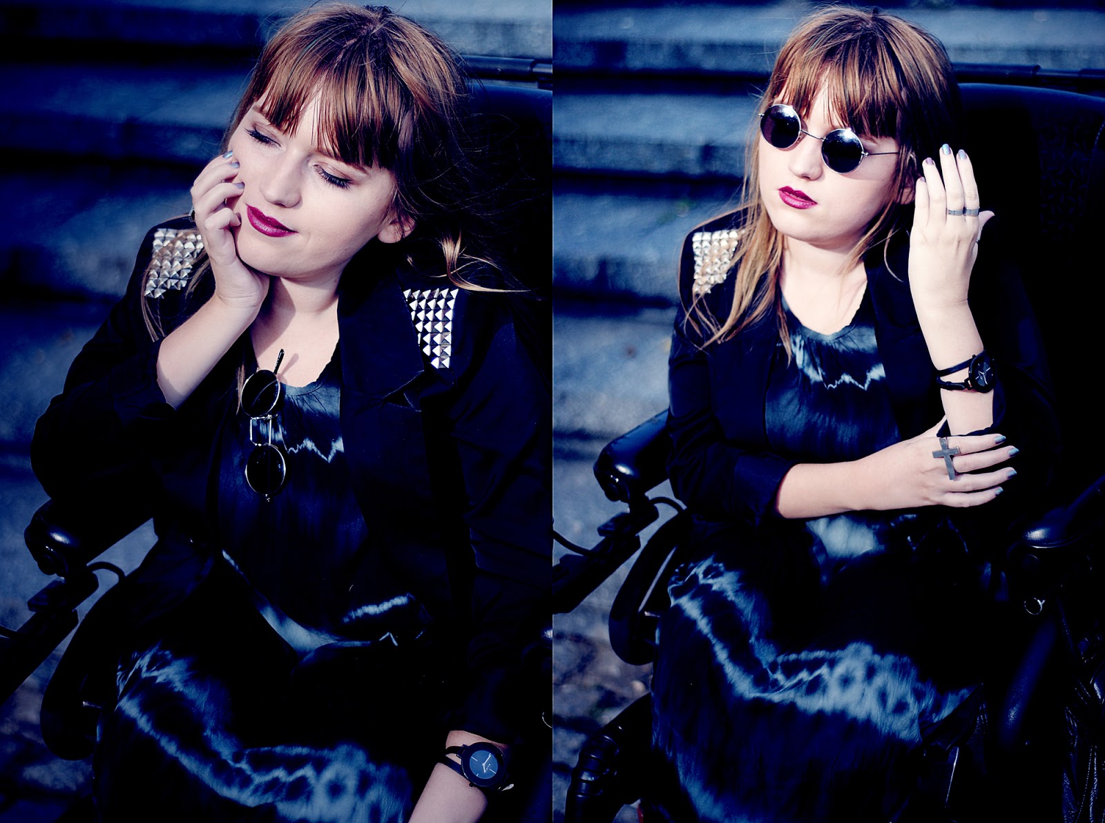 Bazę stroju już właściwie widzieliście. Sukienka pojawiła się w blog z modnymi stylizacjami i inspiracjami poznań street style. Marynarka – była już tutaj kilka razy. Ćwieki są ręcznie nabijane, gdyby ktoś wątpił (ciągle mam łzy w oczach, gdy wspominam stan swoich paznokci po tej pracy… ale było warto). Dodatki – też Wam znane. Buty noszę nałogowo (jeszcze chwila i zrobią się nudne), okulary, pierścionki – także. Jedynymi nowościami są szal i zegarek, który przewinął się kiedyś w jednej stylizacji, ale nie był zbyt zauważalny.