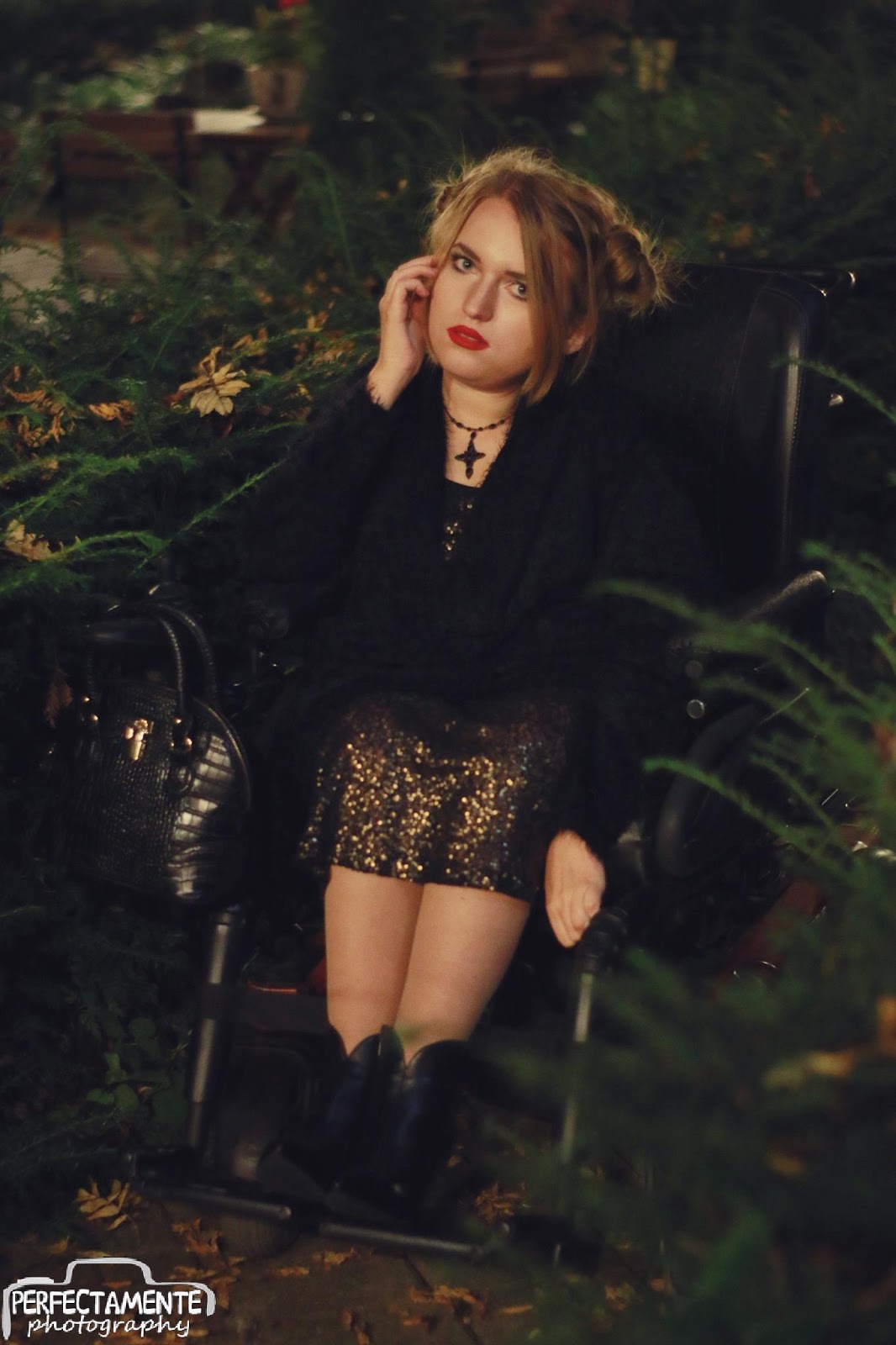 Kawałek dalej znajdziecie fotografie w kolorze – na nich doskonale widać złoto-czarny odcień cekin. Wraz z włochatą fakturą sweterka i skórzanymi botkami nad kostkę, na szpilce, wkraczamy w klimat, który domyślnie ta stylizacja miała odwzorowywać.