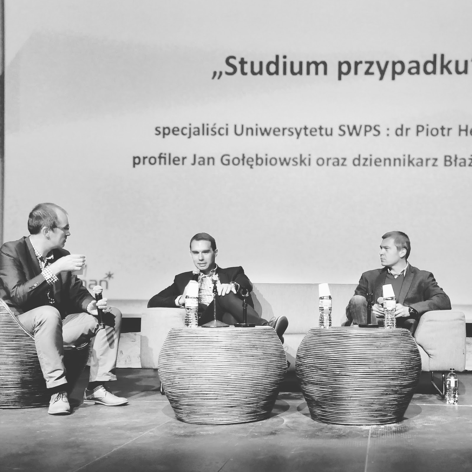 W trakcie prelekcji analizowano przypadek Konwojenta ze Swarzędza. Zastanawiano się kim był, kim mógłby być, co teraz zrobi. Przypominało to trochę zabawę w profilowanie – każdy (taką przynajmniej mam nadzieję) wie, że profilowanie psychologiczne tak nie wygląda – nie polega na gdybaniu przed ekranem, a na solidnej pracy terenowej, biurowej, wywiadach środowiskowych i tak dalej. Mimo to „zabawa” wszystkich wciągnęła. Główne skrzypce grali panowie Piotr Herbowski oraz Błażej Wandtke, konfrontując fakty z opiniami. Pan Jan Gołębiowski stanowił natomiast ciekawe uzupełnienie – zerkał, obserwował, odzywał się rzadko, ale zawsze celnie. Dla mnie, paradoksalnie, to on właśnie wygrał prelekcję – swoim chłodnym spojrzeniem, od którego chodziły dreszcze i analitycznym umysłem, który dopuszczał go do głosu tylko wtedy, gdy mógł powiedzieć coś naprawdę rozsądnego. Oczywiście nie ujmuje to pozostałym aktorom tej sceny – wszyscy dali z siebie ile potrafili i każdego słuchało się z przyjemnością.