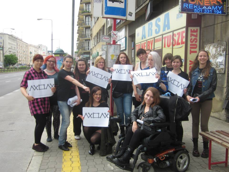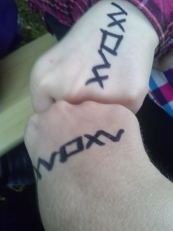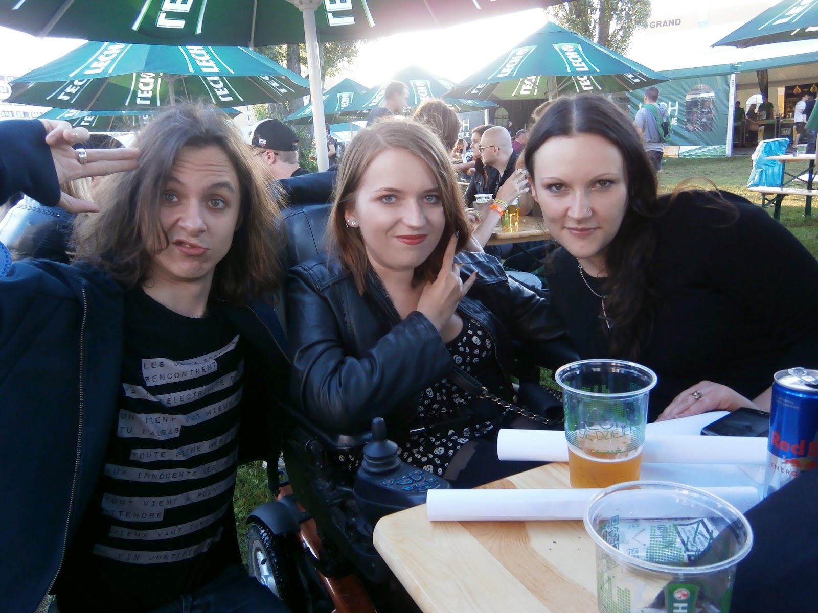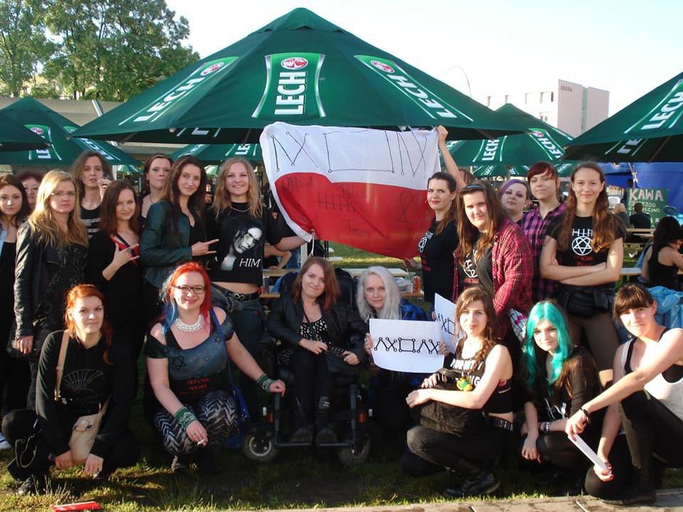 Gdy nadeszła sobota… Nadal do mnie nie docierało, że idę na koncert HIM. Nic. Spotkaliśmy się z fanclubem w umówionym miejscu, zmokliśmy (jakby inaczej!) i dojechaliśmy na Ursy. Razem z dziesiątką ochotników wyruszyłam na rozdawanie ulotek – kartek A3 z napisem „TOT”, które mieliśmy podnieść, gdy zespół zagra „Tears on Tape”. Resztę popołudnia spędziliśmy przy stoliku, z wywieszoną flagą fanclubową, dyskutując, plotkując, dobrze się bawiąc. I poznając nowych ludzi. Nie wiedziałam, że fanów HIM jest tak wielu. Co chwilę ktoś do nas dołączał!